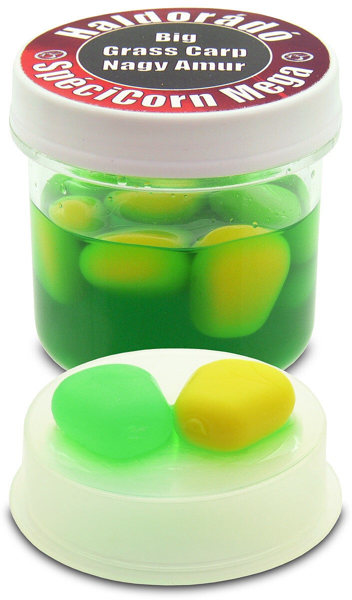 Das SpéciCorn Mega ist nichts anderes als ein großformatiger, aromatisierter, bunter, schwimmender Gummi-Mais. Er widersteht selbst den gefräßigsten Kleinfischen – nicht einmal Welse können ihn vom Haarvorfach abziehen. Der Name SpéciCorn Mega weist bereits auf die Größe hin: Sie ist dreimal so groß wie unser herkömmlicher Gummi-Mais.